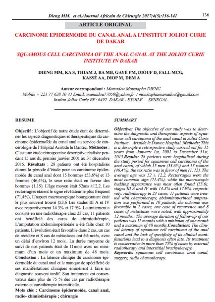CARCINOME EPIDERMOIDE DU CANAL ANAL A L’INSTITUT JOLIOT CURIE DE DAKAR / SQUAMOUS CELL CARCINOMA OF THE ANAL CANAL AT THE JOLIOT CURIE INSTITUTE IN DAKAR