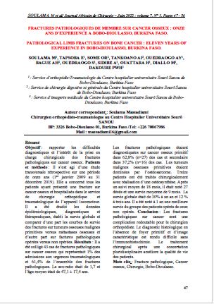 FRACTURES PATHOLOGIQUES DE MEMBRE SUR CANCER OSSEUX : ONZE ANS D’EXPERIENCE A BOBO-DIOULASSO, BURKINA FASO. PATHOLOGICAL LIMB FRACTURES ON BONE CANCER : ELEVEN YEARS OF EXPERIENCE IN BOBO-DIOULASSO, BURKINA FASO.